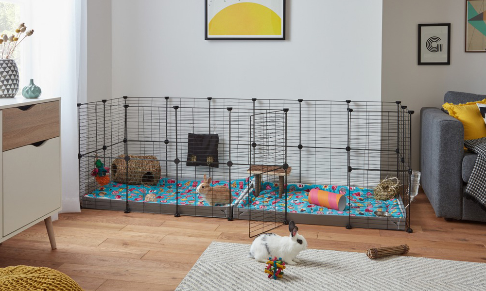 L’enclos doit contenir : bac à litière, râtelier, gamelle d’eau, cabane/tunnel… le lapin doit pouvoir s’étaler de tout son long et faire quelques sauts malgré les équipements. Vous pouvez retrouver plusieurs types d’enclos et équipements dans notre boutique en ligne.