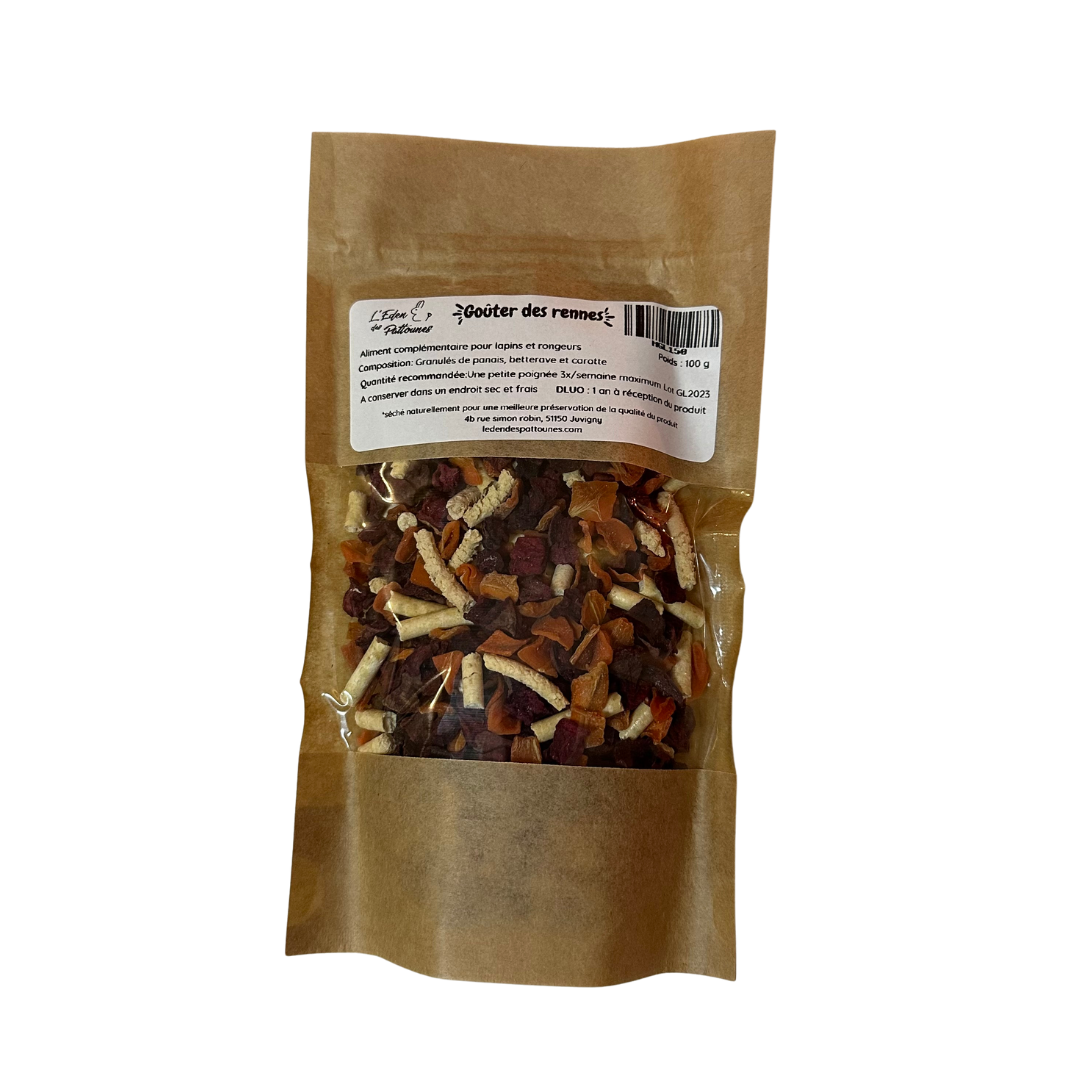 • 🥕 Mix “Goûter des Rennes” – 100 g de granulés naturels au panais, betterave et carotte
